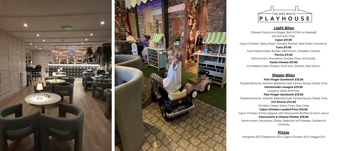 Went to The Wee White Playhouse for the play area, which was great as its separate from the main dining area but has tables for in the play area which is a great size. Service was great and the food was so tasty, decent portions and good price. Will definitely be back!